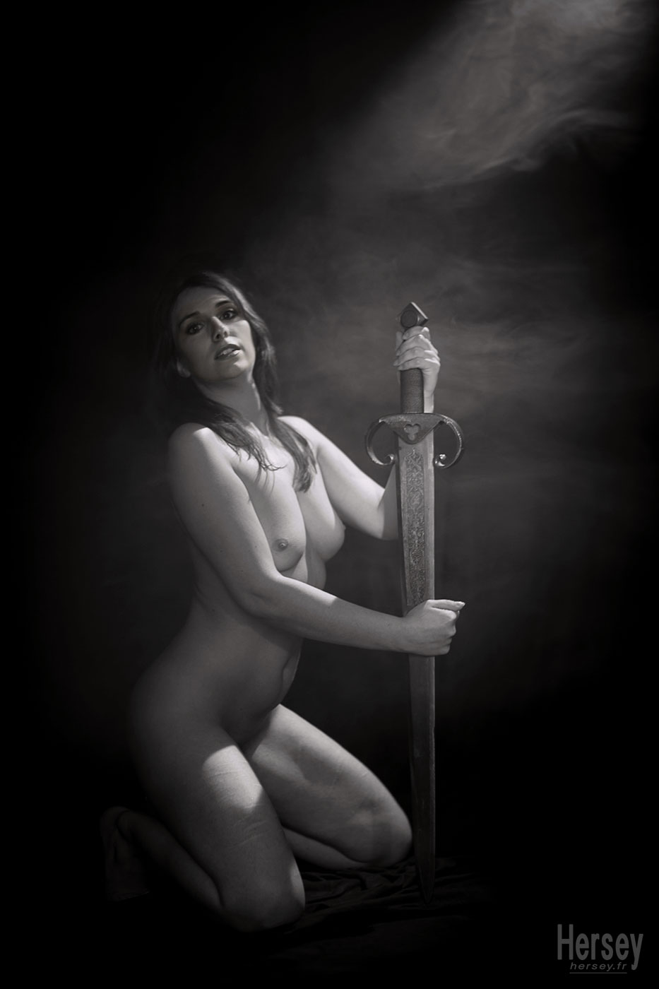 Séance photo de charme en studio avec une épée de collection ancienne