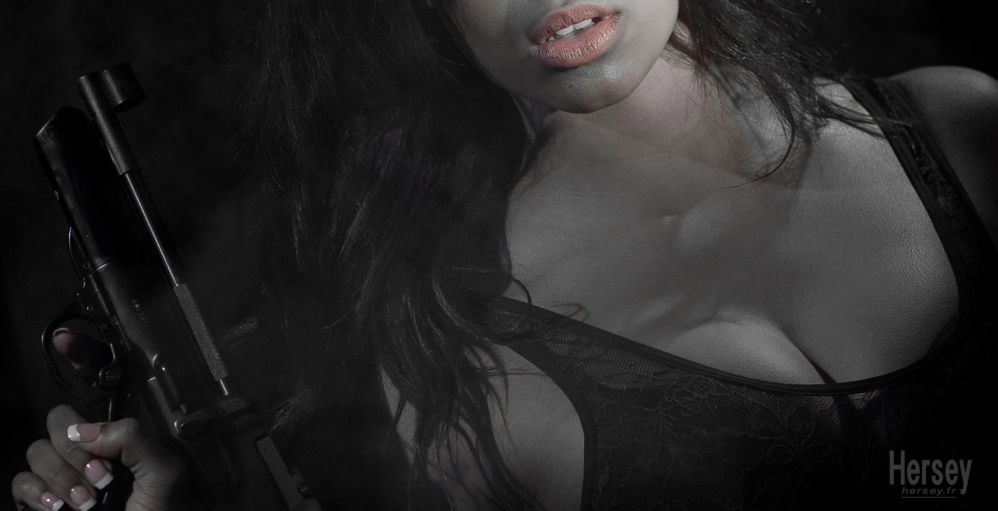 Portrait d’Olivia en mode lingerie sexy. Séance photo sur le thème ‘James Bond Girl’