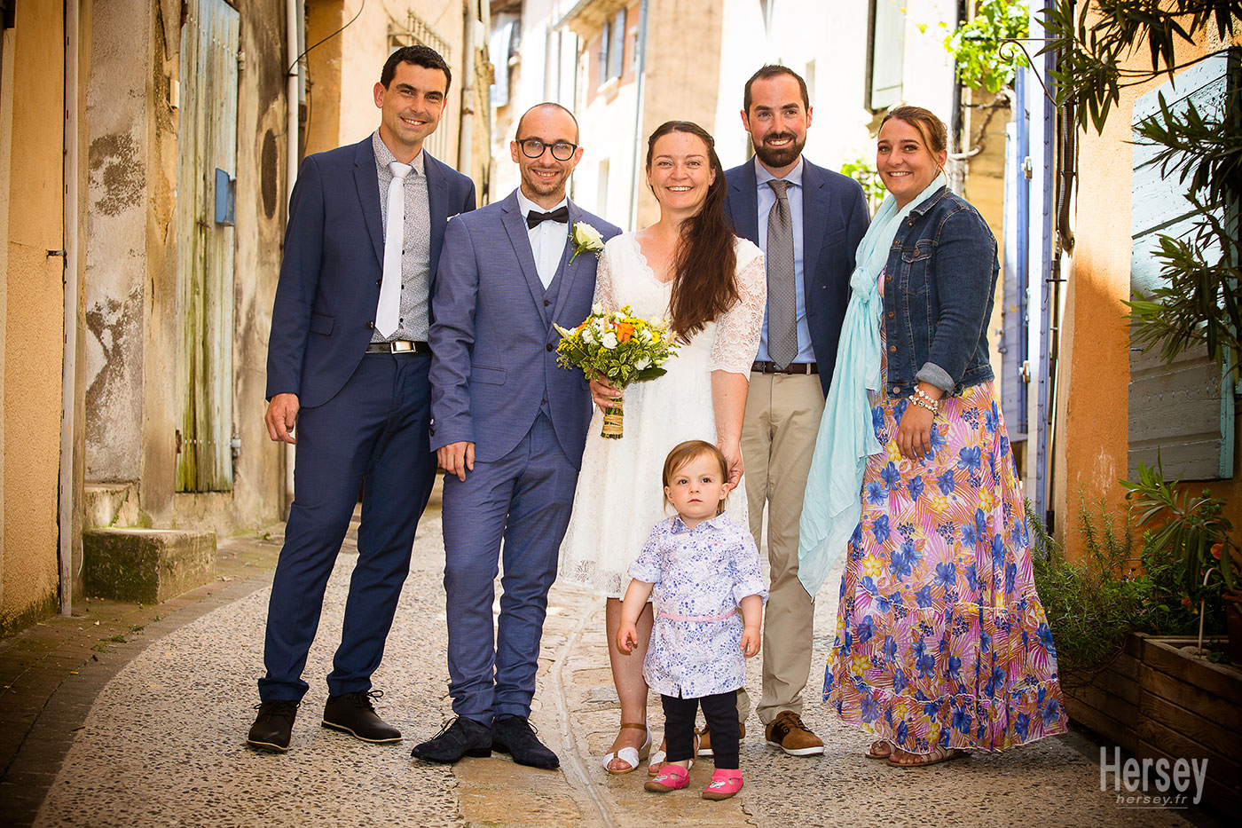 Traditionnelle photo des mariés avec les témoins pour un mariage dans le Lubéron dans une rue typique de Jouques